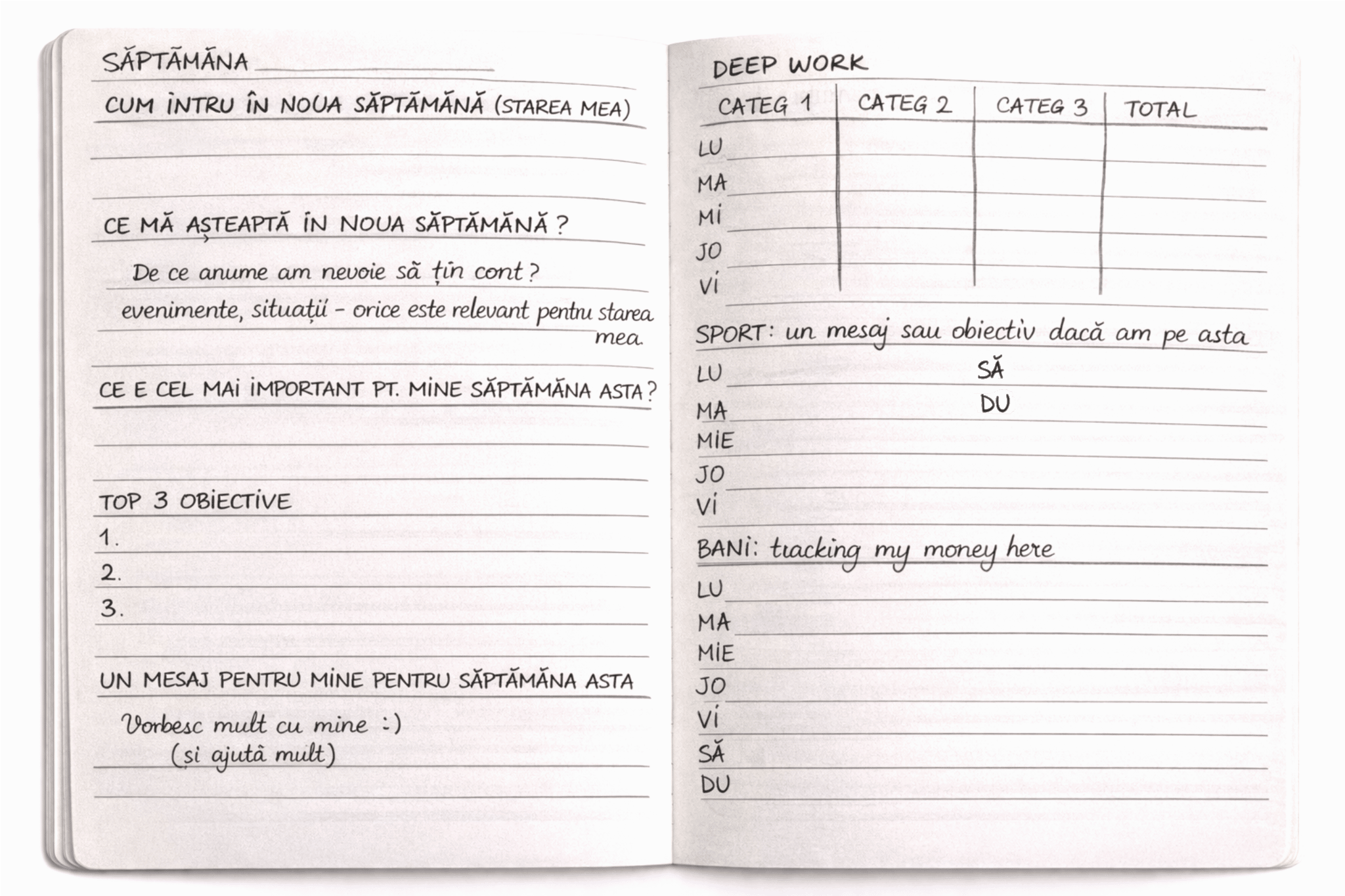 Focus săptămână și tracking deep work, sport, bani